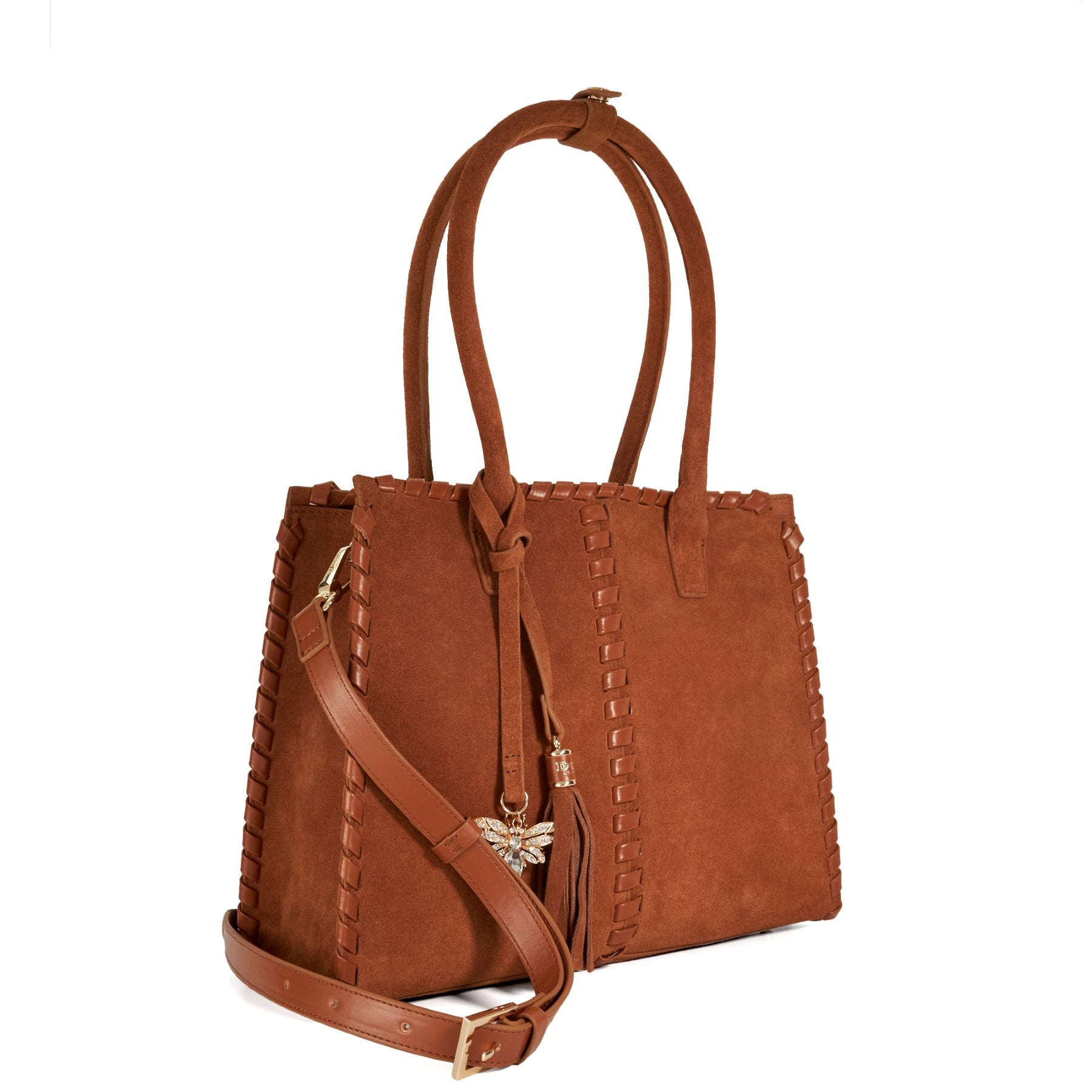 Update your accessory collection with Darlingtons featuring double grab handles and crafted from luxurious premium suede. Adorned with woven stitch details tassel accents and a playful Dune bug charm this tote adds a perfect blend of fun and sophistication to your look. The ideal statement piece to elevate your wardrobe this season.