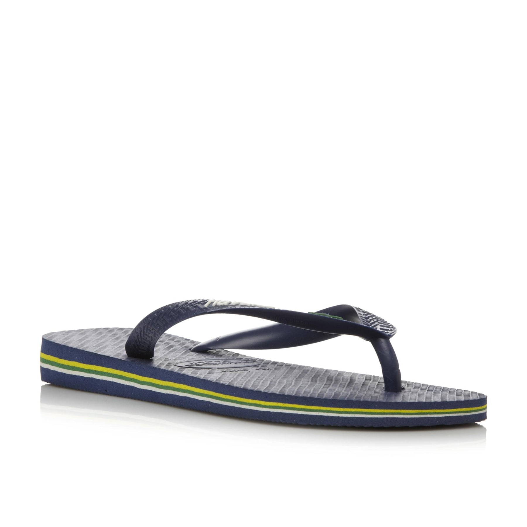 Get summer ready with this classic logo and flag Havaianas flip flop. Features a simple but eye-catching streak of colour through the sole. Sizing is an adjusted fit meaning the foot fits to the edge of the sole.