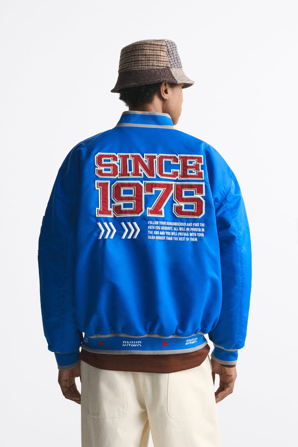Collared jacket made of technical fabric. High neck and long sleeves. Flap pockets at the hip and inside pocket detail. Contrast patch and embroidery on the back. Ribbed trims. Zip-up front.
