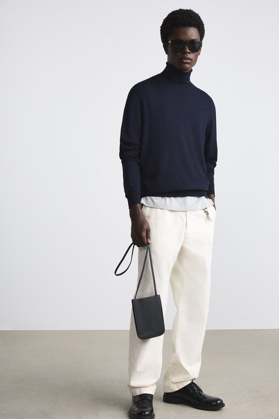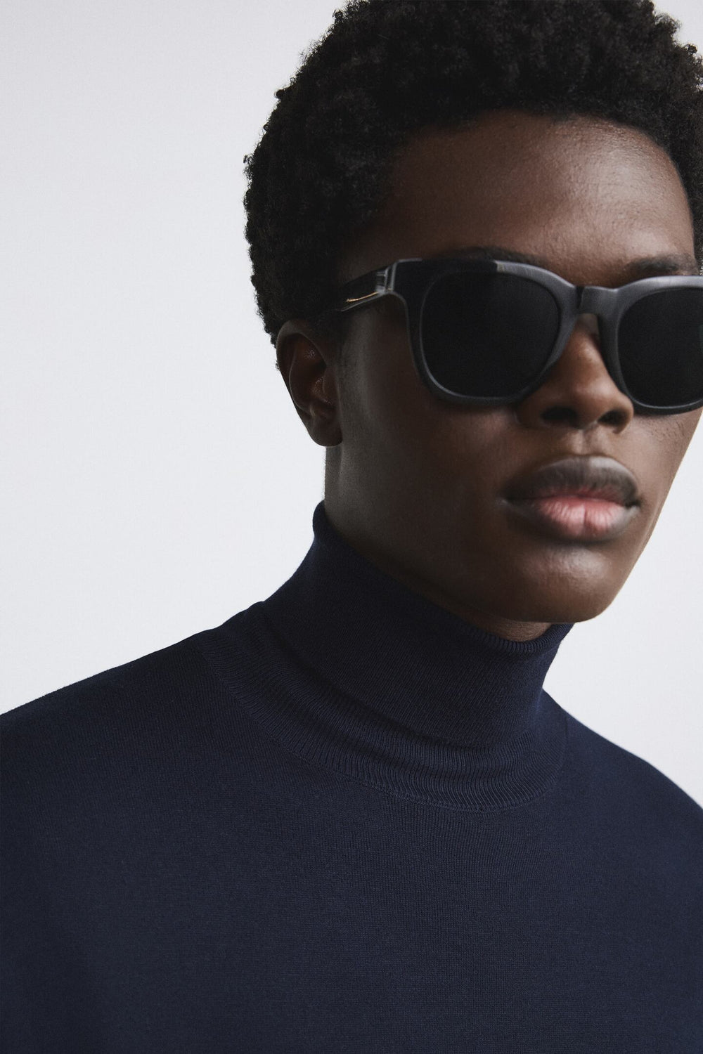Lightweight straight fit sweater with a high neck and long sleeves. Ribbed trims.