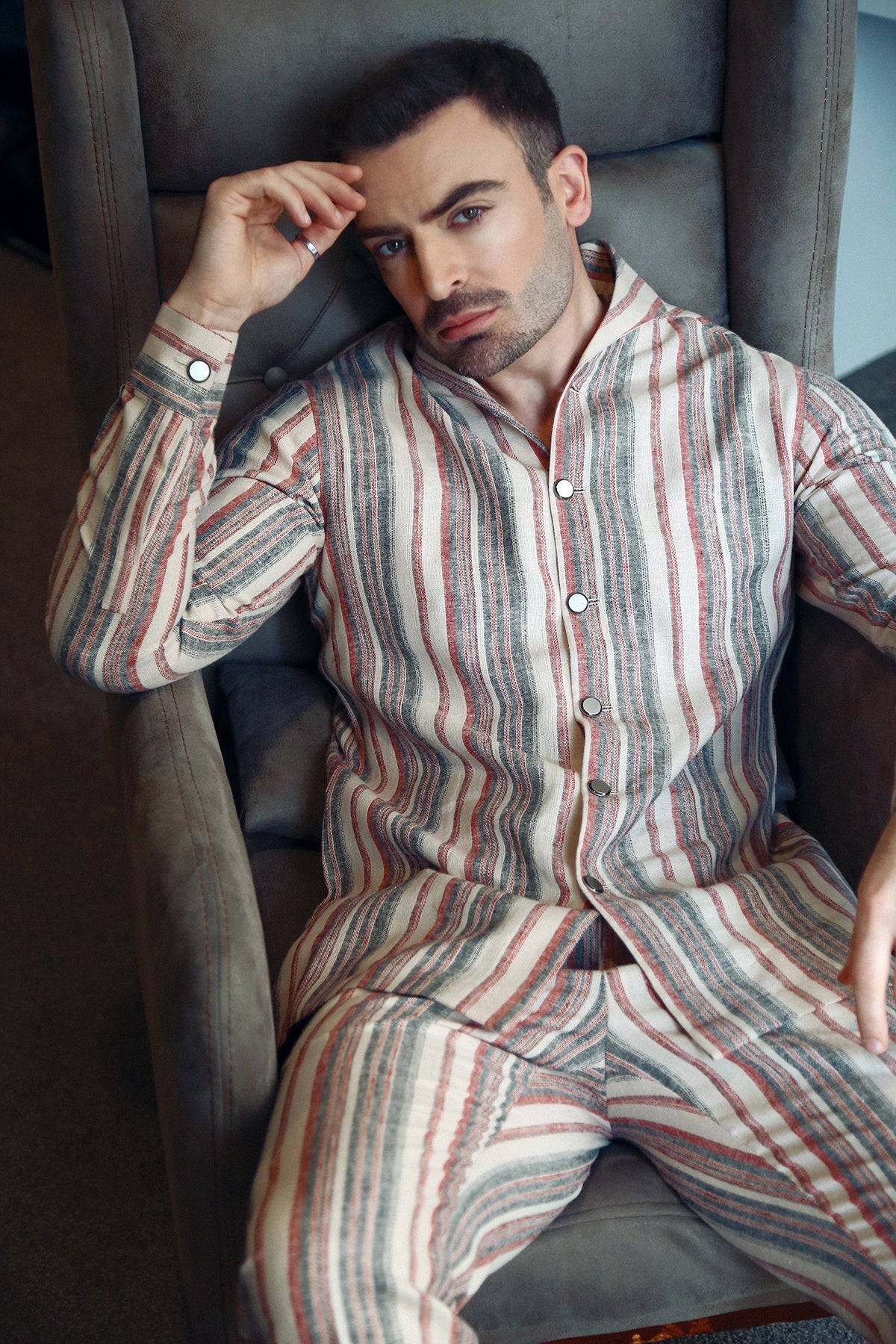 Elevate your style with our striped cotton Suit that will surely make you stand out, featuring a specially engineered weave that adds depth and texture. The shawl collar shirt with metal button details creates a luxurious finish, while the 100% cotton fabric ensures comfort and breathability. Perfect for dressing up or down, this suit is a versatile addition to any wardrobe.
